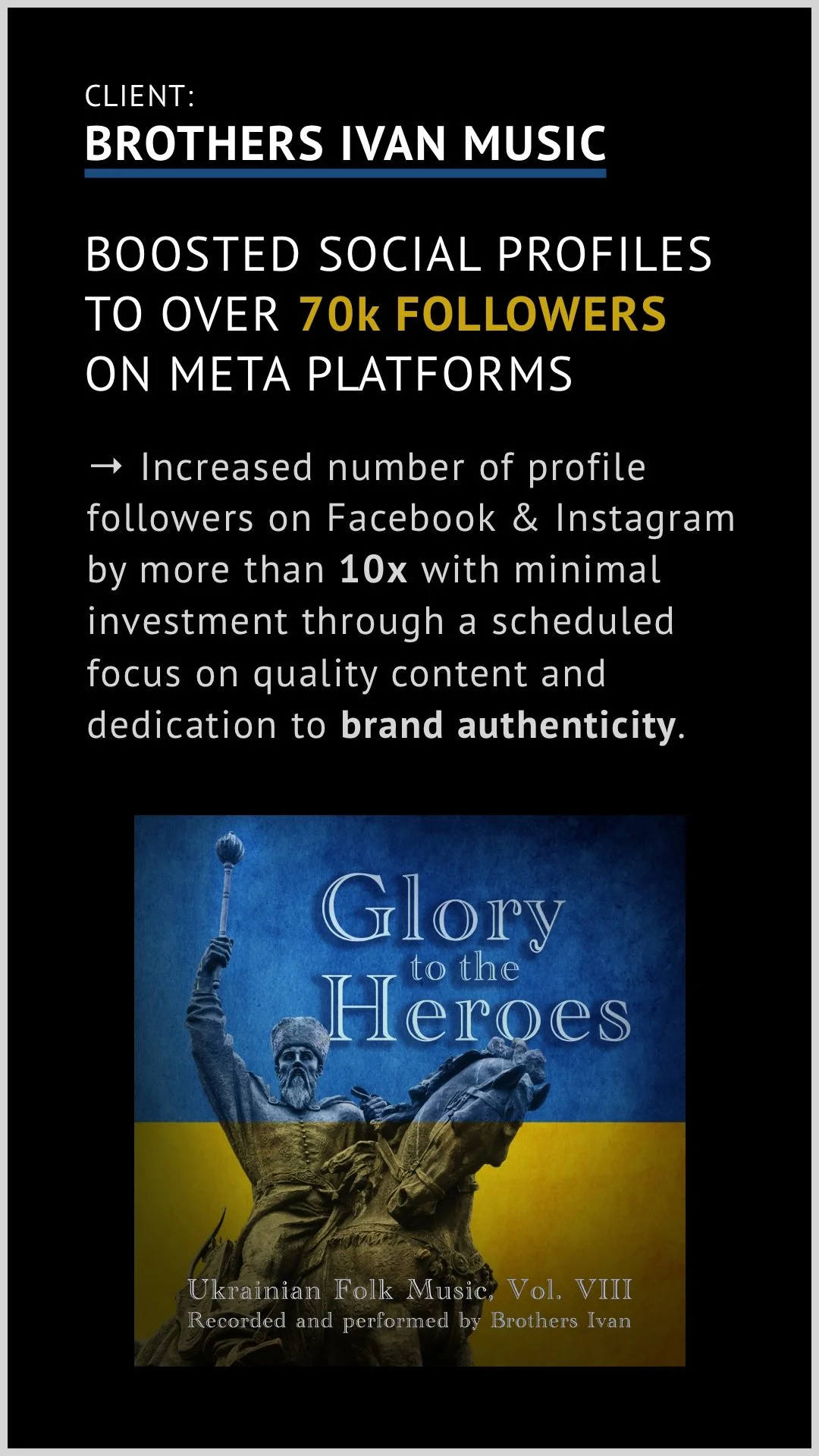 Under the artist name Brothers Ivan, Ukrainian folk music is being preserved and cherished, many of the songs having no previous audio recordings in existence. Our Facebook & Instagram pages have now grown to over 70k followers combined and we regularly receive messages of support that help keep the project moving forward. Now in its 8th volume in the musical series, along with a Christmas album, and with more volumes planned for release, this is our contribution to Ukraine’s struggle and ultimate victory.